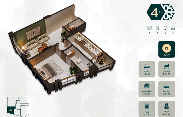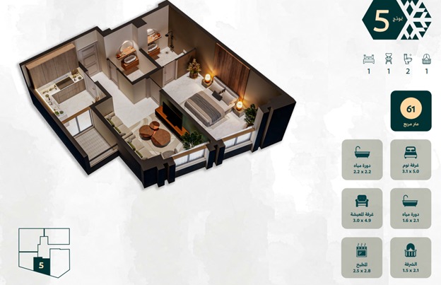 Own a stylish and compact 1-bedroom apartment in the Martil project in Maabailah, crafted wi th high-end materials and finishes typically found in premium hotels.